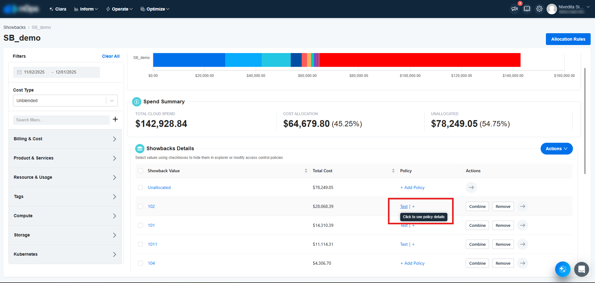 Click the Policy Name link in the Showbacks table to open Policy Details.