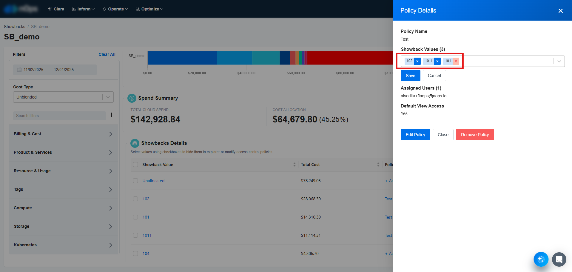 A Showback policy controls which Showback values a user can access. Admins can define policies to grant access to specific cost categories, ensuring users only see data associated with their assigned Showback values.